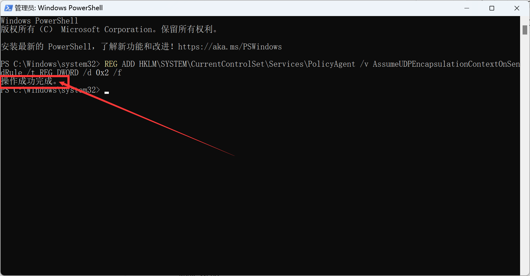 REG ADD HKLM\SYSTEM\CurrentControlSet\Services\PolicyAgent /v AssumeUDPEncapsulationContextOnSendRule /t REG_DWORD /d 0x2 /f